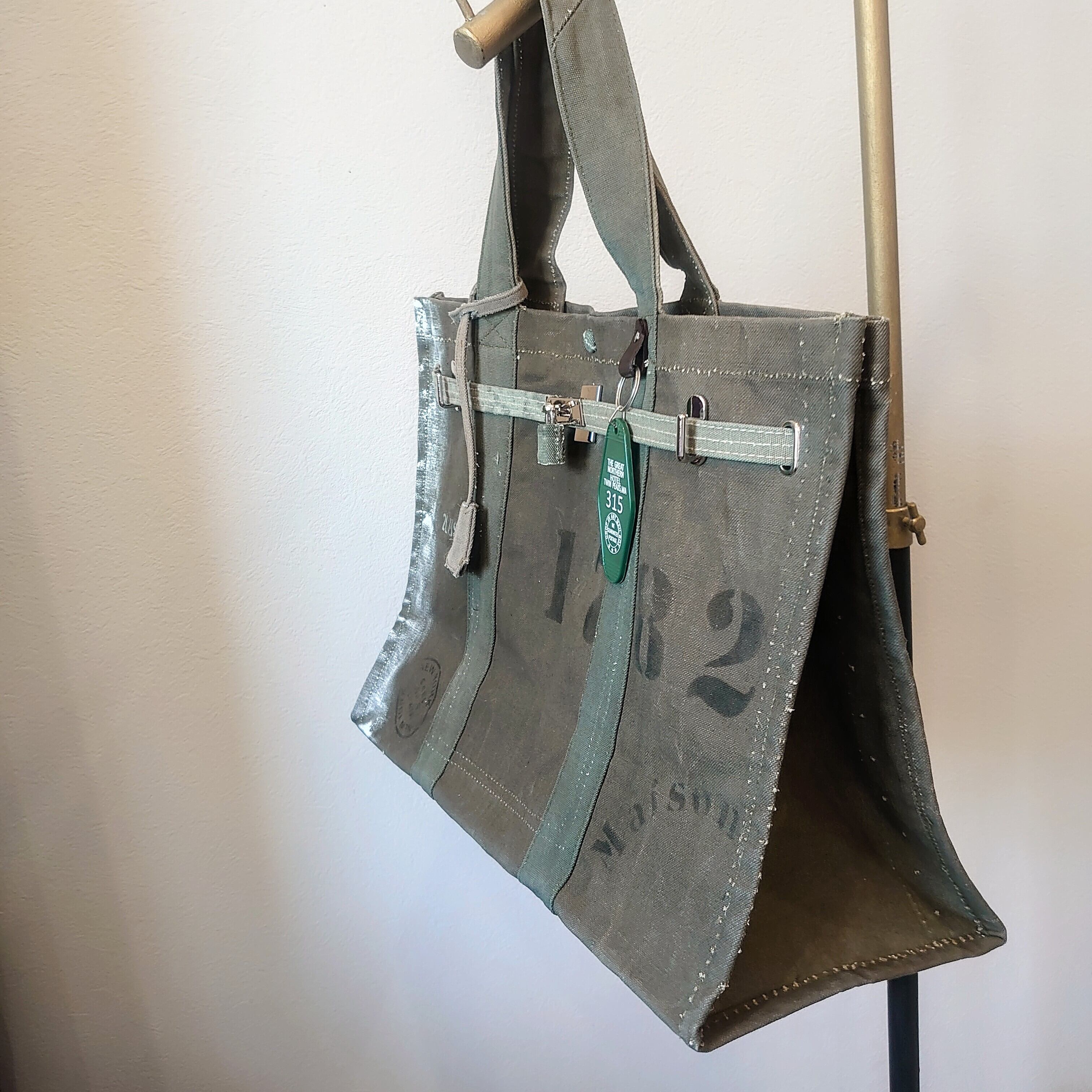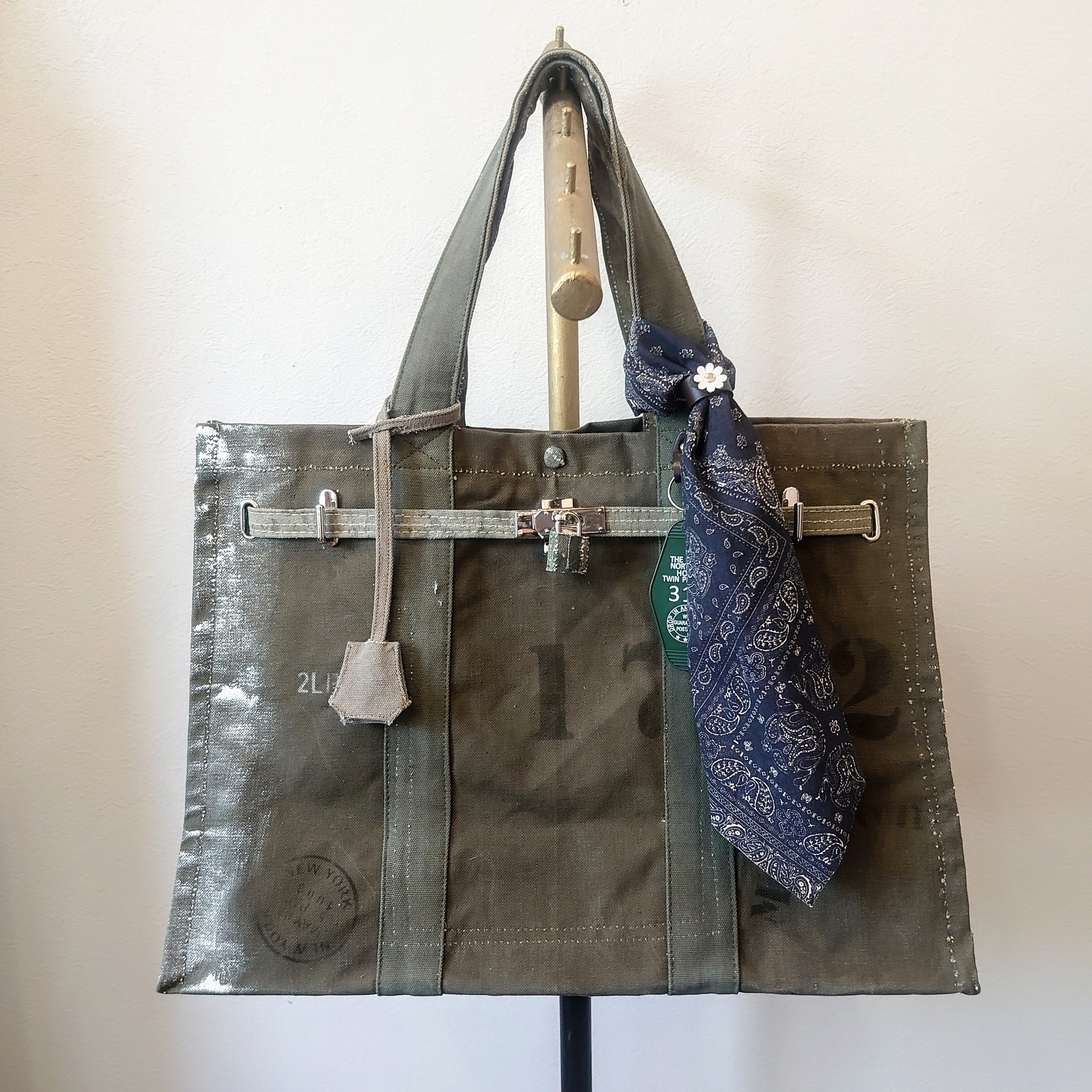 アメリカ軍で使用されていた、ヴィンテージのミリタリーテント生地を再構築して作られた、味わいのあるトートバッグをベースに、同生地のベルトや金具を施して、デザインとしても洗練された印象に。