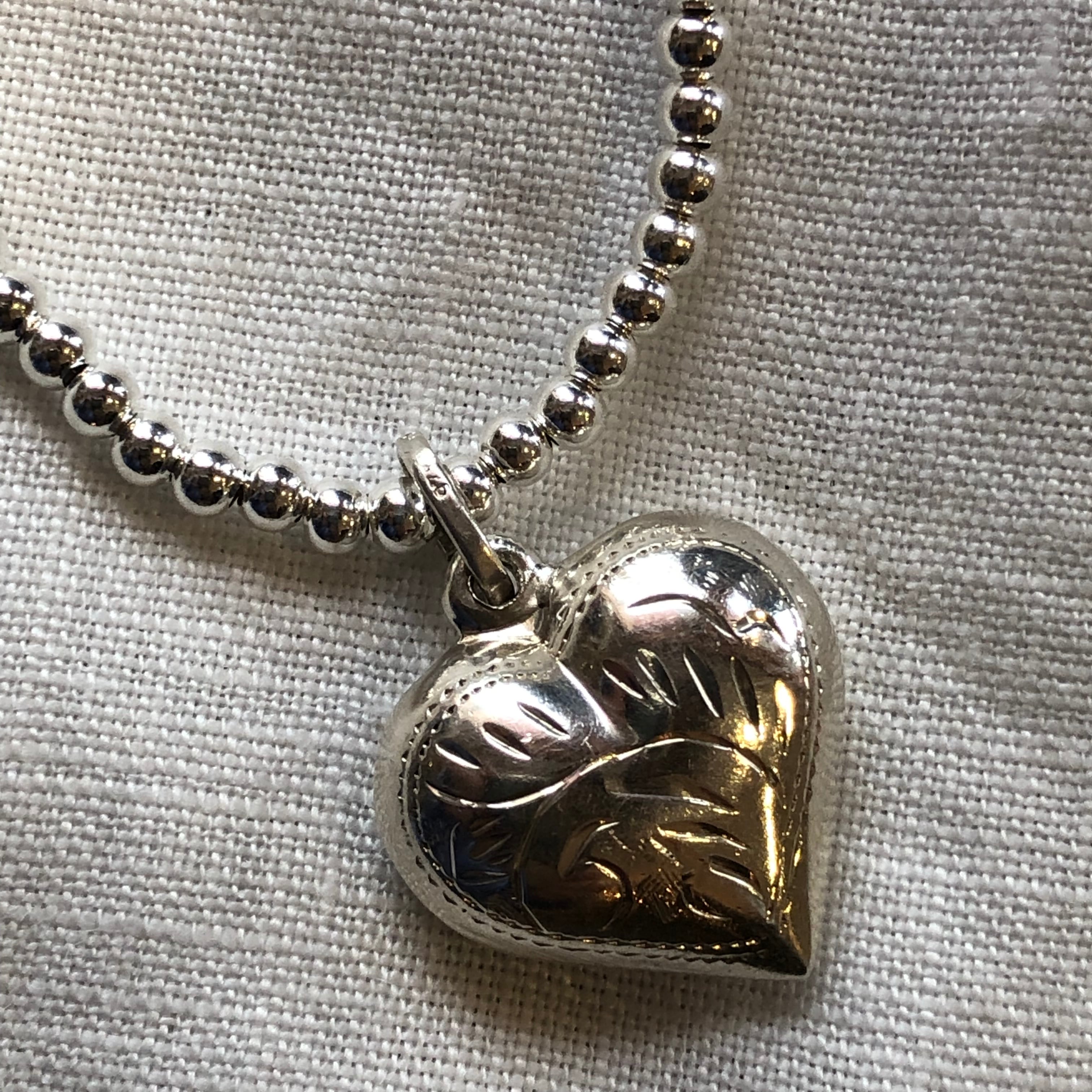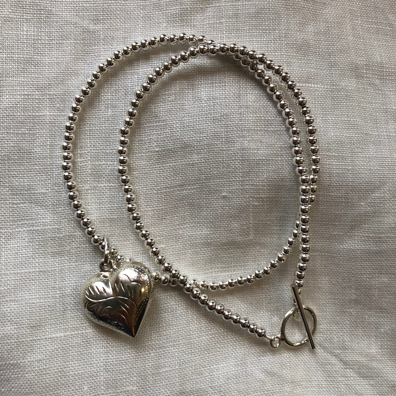 Doux grain ヴィンテージハートチャーム付きシルバーパールネックレス