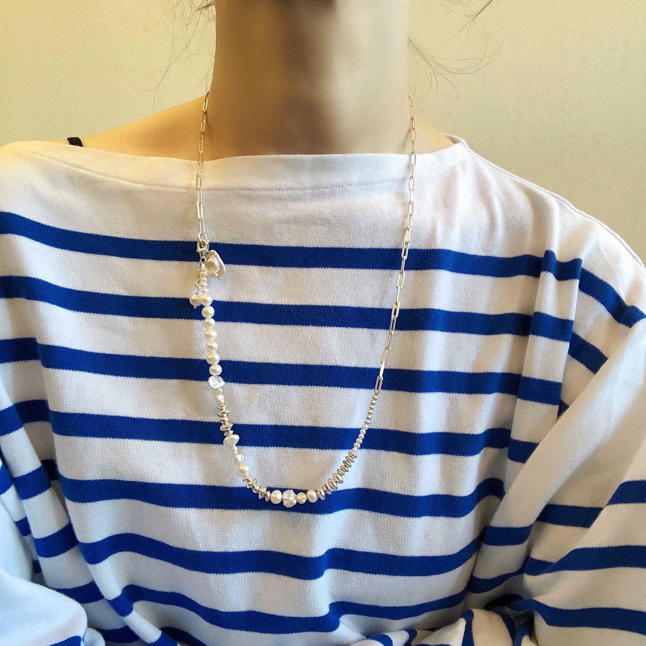 スクエアチェーンにパールとシルバーパールをミックスして繋いだネックレスです