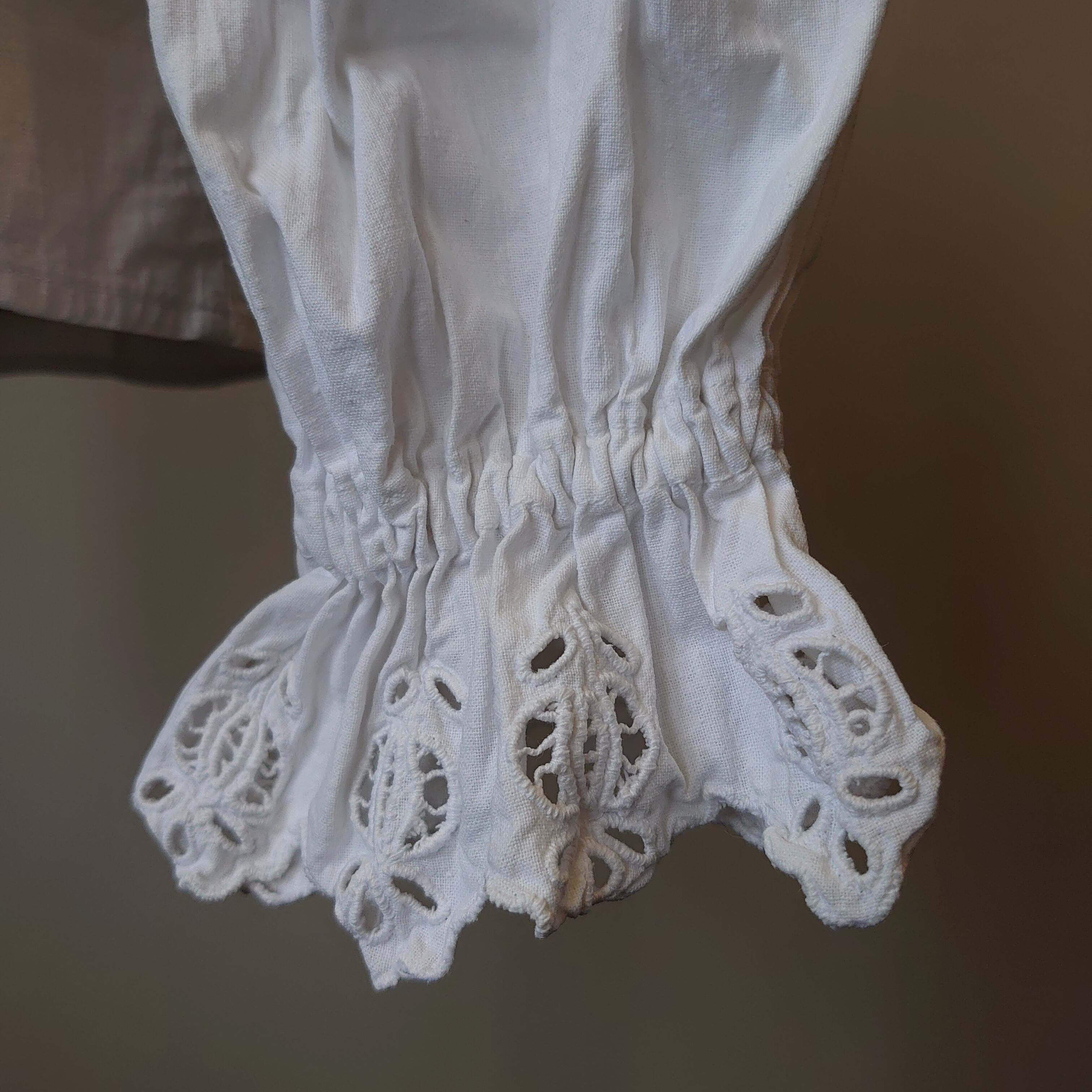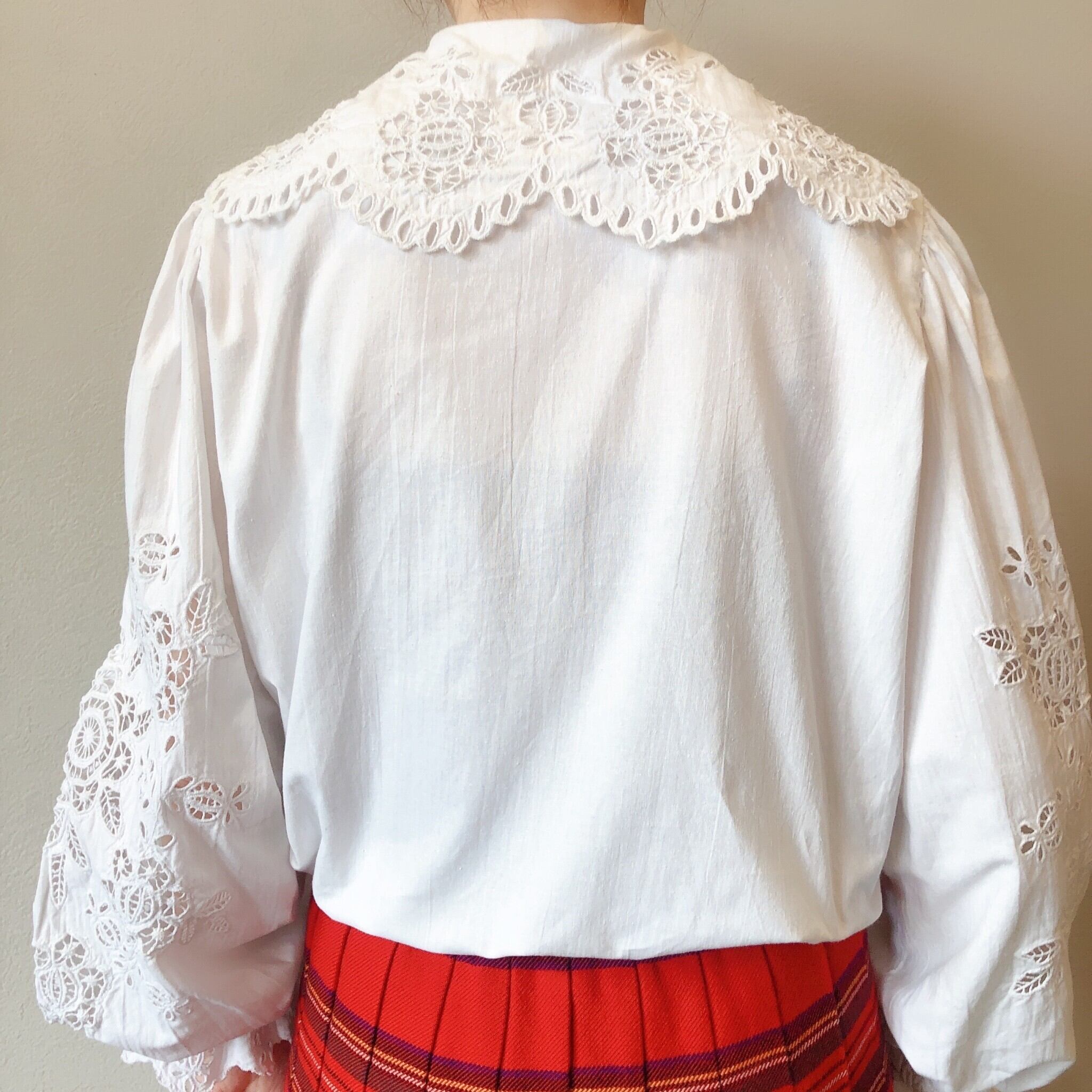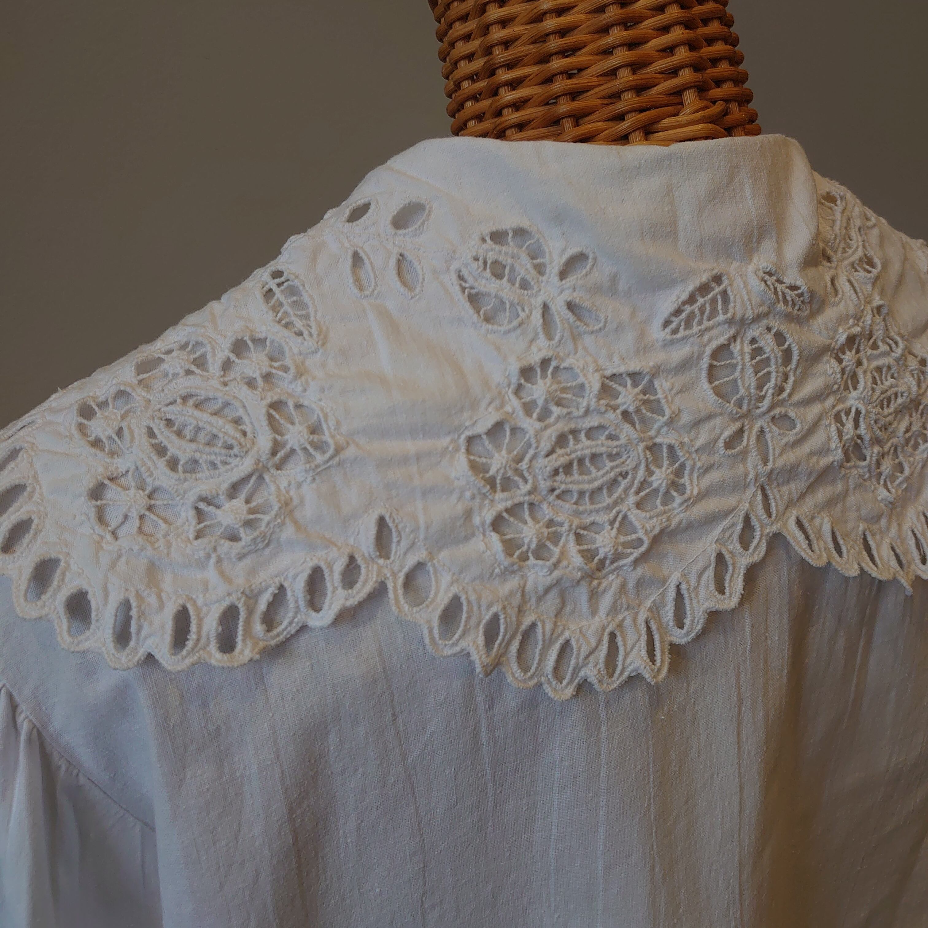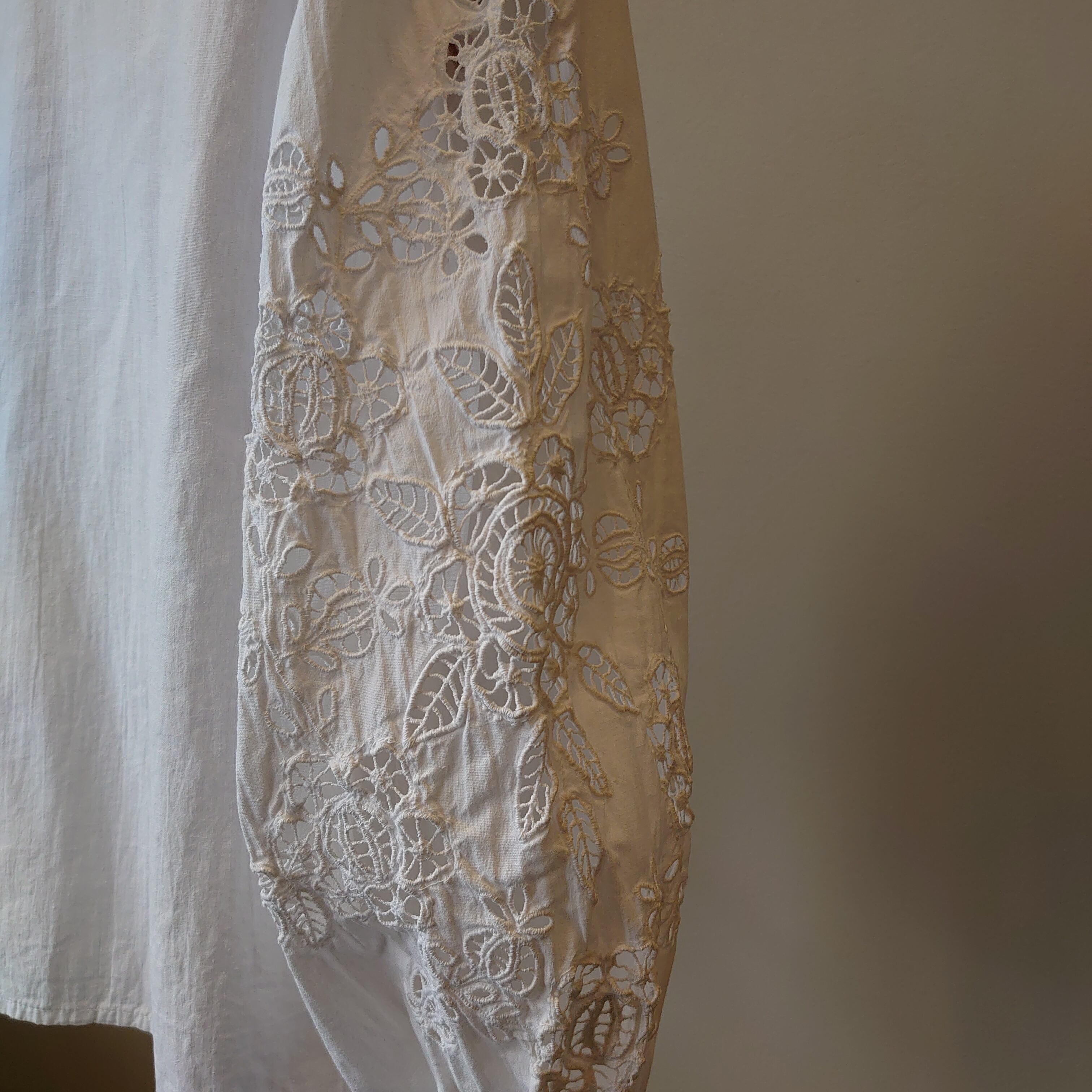 コットン地のベースに、襟、胸、袖に贅沢に施された繊細な刺繍が非常にロマンティックな一着。