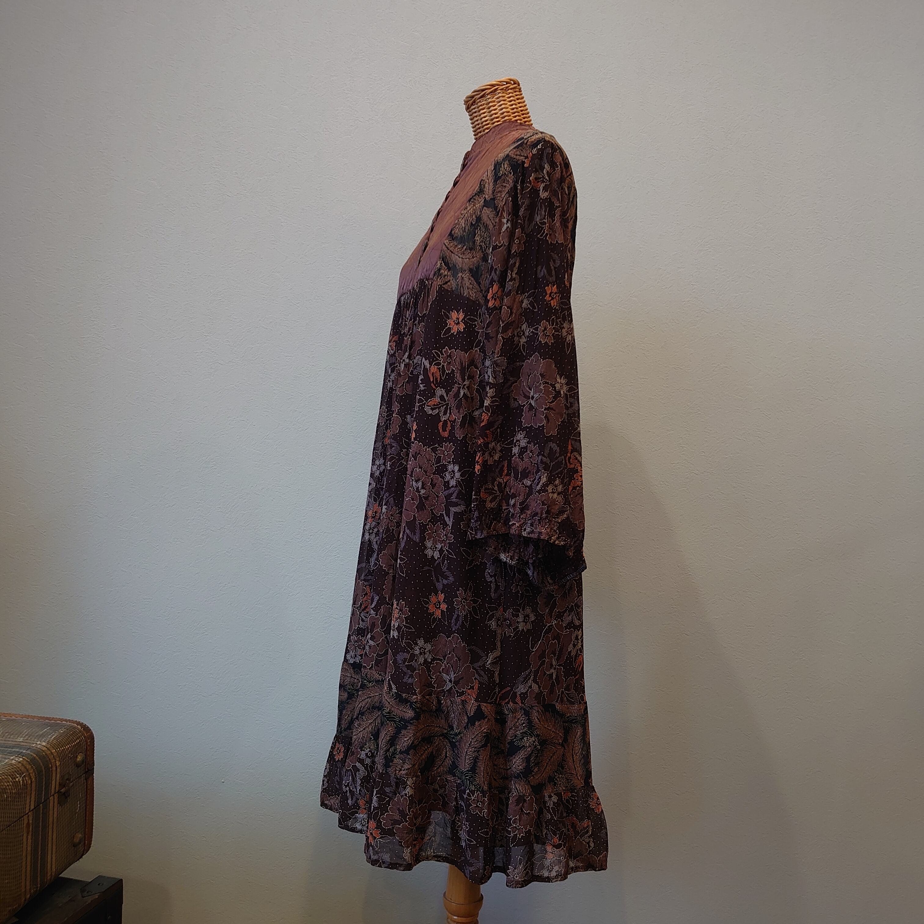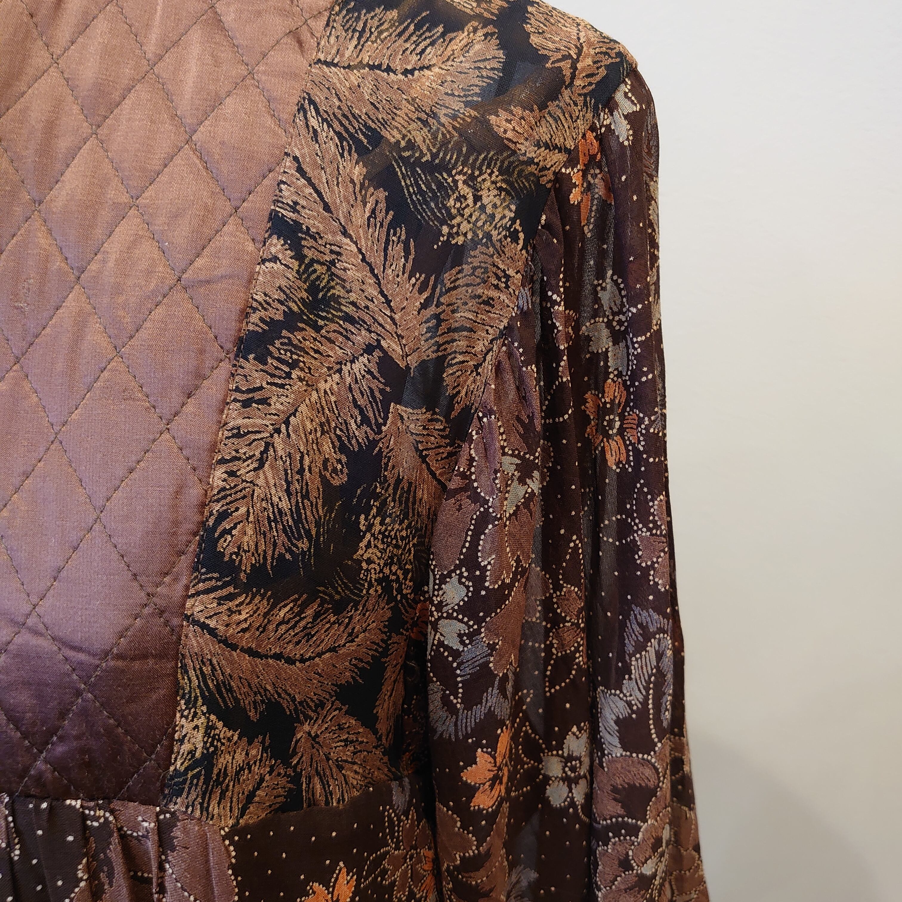 ベースにはボタニカル柄のシフォン生地、裾と肩付近はフェザー柄のパッチワークになっています。