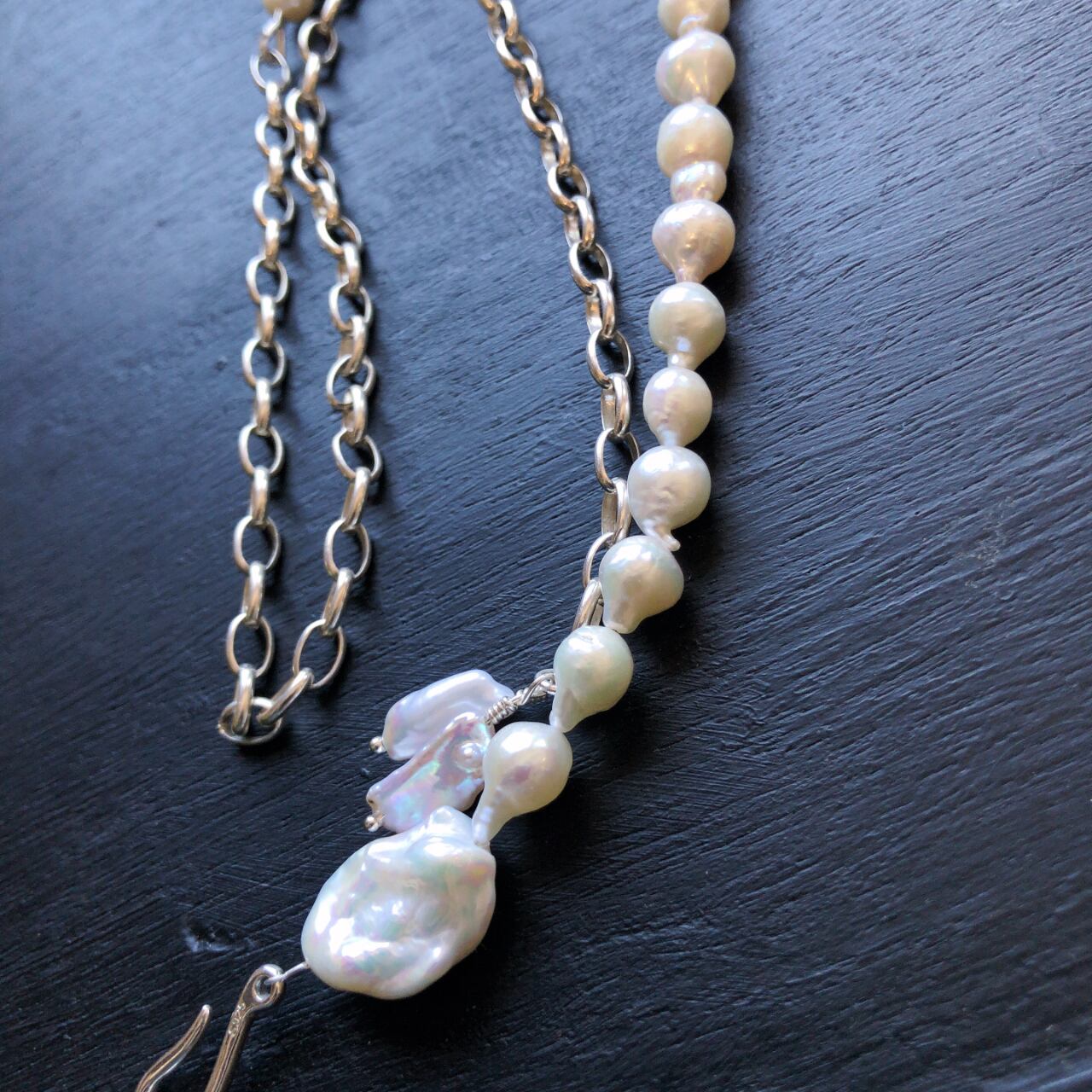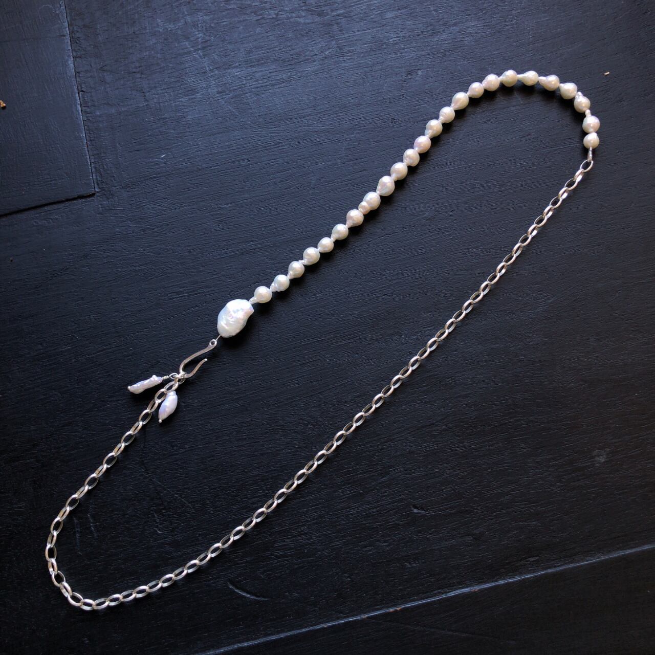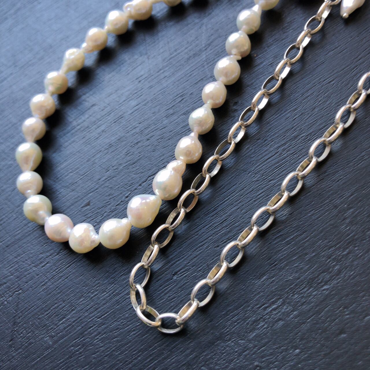 大きめの小豆チェーンにティアドロップパールを繋いだネックレス