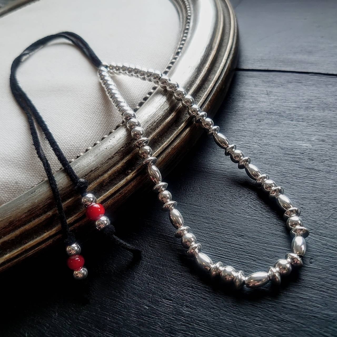 赤とシルバーのビーズが